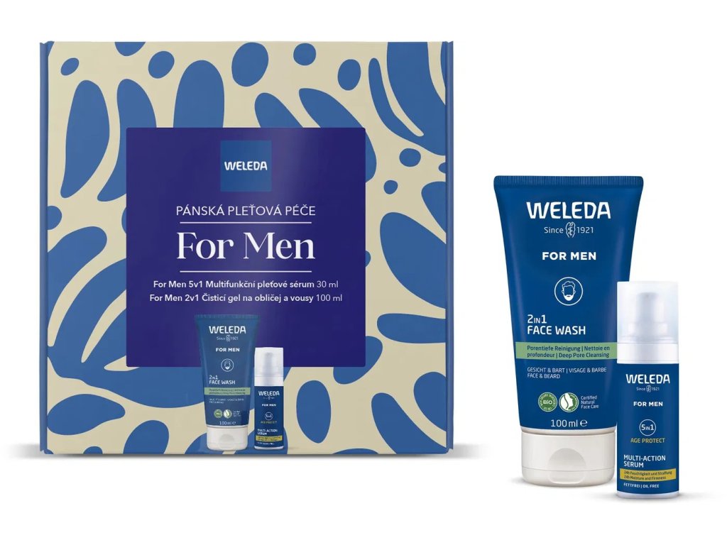 Pánská Duo pleťová péče Weleda For Men v dárkovém balení se postará o dokonale hydratovanou, vyživenou a pěstěnou pokožku. Sada obsahuje Multifunkční pleťové sérum FOR MEN 5v1 a Čisticí gel na obličej a vousy FOR MEN 2v1. Sérum viditelně revitalizuje pleť, působí proti známkám stárnutí a zlepšuje celkový vzhled pleti. Snadno se vstřebává bez pocitu mastnoty. Čisticí gel dokonale odstraňuje nečistoty i nadbytečný olej z povrchu pleti a zanechává ji svěží.