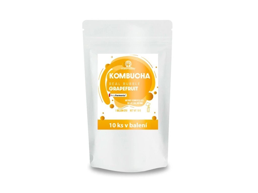 Složení: prášek Kombucha SCOBY /fermentovaný černý čaj, čajové polyfenoly, flavonoidy, organické kyseliny, SOD-L), sušená šťáva z grapefruitu (prebiotická směs – inulin, fruktooligosacharidy), kyselina citronová, hydrogenuhličitan sodný (jedlá soda), sladidlo erythritol, maltodextrin, probiotika Bacillus coagulans MTCC 5856.