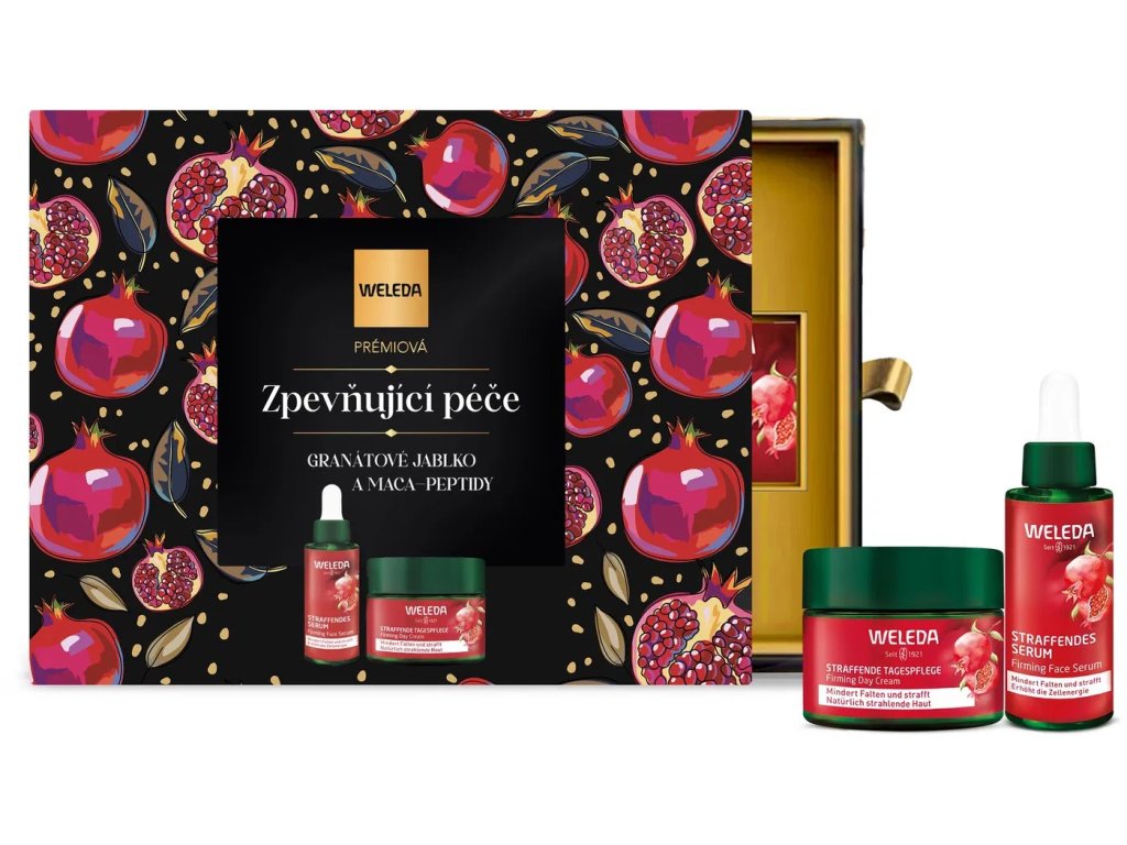 Prémiová zpevňující péče Granátové jablko a Maca-Peptidy od značky Weleda obsahuje 2 luxusní produkty péče o pleť. V setu najdete zpevňující sérum a denní krém z řady Granátové jablko a Maca-Peptidy. Tato inovativní sada kombinuje antioxidační sílu oleje ze semínek granátového jablka a omlazující účinky peptidů z kořene Maca. Stimuluje tvorbu kolagenu v pleti a pomáhá redukovat vrásky. Při pravidelném používání bude vaše pokožka viditelně pevnější, pružnější a krásně rozjasněná.